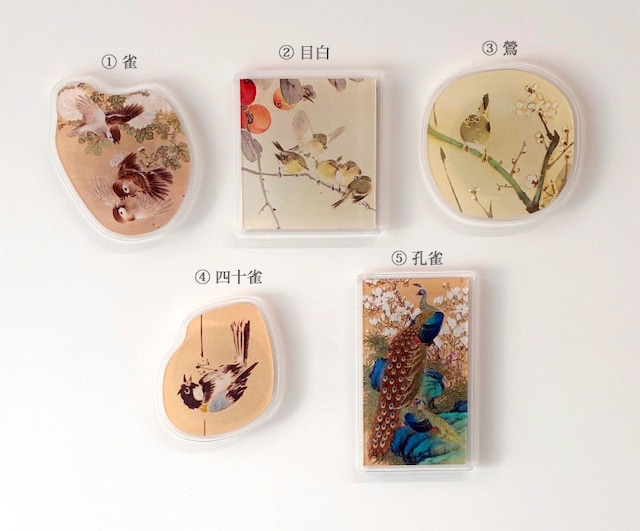 「とりマニア」展 特製グッズ 第2弾として、アクリルマグネットの登場です。 人気の高い鳥たちが絵から飛び出しマグネットになりました。 あなたの推しの鳥はどちらでしょう? 逸翁美術館オリジナルグッズ 逸翁美術館所蔵 鳥たちをモチーフにしたアクリルマグネット5種 ①雀 「花鳥図」 鈴木華邨 ②目白 「柿目白図」鈴木華邨 ③鶯 「梅鶯図」 久保田米僊 ④四十雀「竹四十雀図」英一蝶 ⑤孔雀 「木蓮孔雀図」山田秋坪 サイズ:①~④ 約4.5~5cm角 程度 / ⑤のみ W3.6cm × H 6.5cm